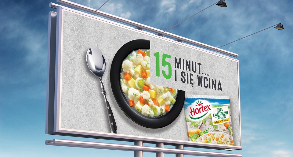 Autorzy kreacji zastosowali prosty zabieg – łatwy do odczytania na miejskich billboardach. Talerz jest równocześnie tarczą zegara, odliczającą czas przygotowania zupy.
